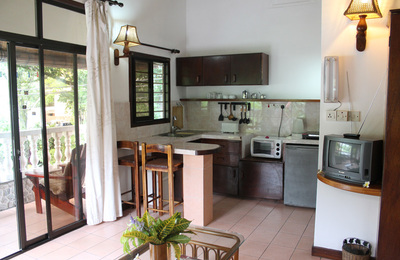 Zimmer: Die insgesamt 7 Bungalows sind ausgestattet mit Ventilatoren, Klimaanlage, große Fenster, TV (nur lokale Fernsehsender), Bad/WC/Dusche, kleine Küchenzeile, private Veranda, kleiner Wohnbereich, komfortable Betten Safe,
