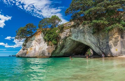 Halbinsel, welche geprägt ist von bizarren vulkanischen Formationen und typischem neuseeländischen Wald voller Baumfarne und Teebäume. Wir sehen Überreste der einst im Norden weit verbreiteten mächtigen Kauri-Bäume, die bis zu 2000 Jahre alt werden. Dies sind Neuseelands Vertreter der Araukariengewächse. In der Mercury Bay erkunden wir die Juwelen neuseeländischer Strände und erwandern beliebte Besucherziele: auf der Wanderung zur Cathedral Cove von Hahei laden lange weiße Sandstrände zum Baden im Südpazifik ein (zeitabhängig). Wer will kann sich bei Ebbe am Hot Water Beach einen Pool in den Sand buddeln und sich an unterirdischen heißen