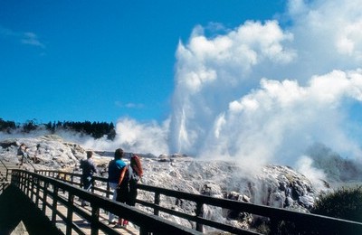 Heute Vormittag bekommen Sie bei Rotorua garantiert einen scheuen Kiwi-Vogel zu Gesicht: in einer Aufzuchtstation, die hilft, den Bestand der beinahe ausgestorbenen heimischen Art zu sichern. Dann besuchen Sie den Thermalpark Whakarewarewa mit dem Kulturzentrum Te Puia. Vor der Kulisse speiender Geysire und dampfender Quellen lernen Sie die Sitten und Bräuche der ersten Einwanderer Neuseelands kennen. Hier befindet sich auch das Maori Arts and Craft Institute, wo Sie Holzschnitzer bei ihrer Arbeit beobachten können. Dann werden Sie von den Maori mit farbenfroher polynesischer Folklore, wie traditionelle Tänze und Gesänge, überrascht. Auch der aufsehenerregende Kriegstanz, der "Haka", darf nicht fehlen. Abschließend gibt es ein reichhaltiges Buffet - Mittagessen mit köstlichen Speisen aus dem "Hangi"- Erdofen. Sie verlassen Rotorua - vorbei an der wald- und wasserreichen Wildnis des
