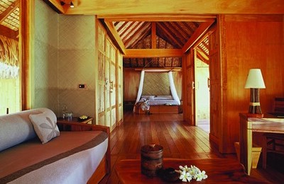 Unterbringung: Die 48 Overwater Bungalows und 12 Beach Suites sind ca. 100 qm groß. Alle sind mit Klimaanlage, Deckenventilator, Telefon, Minibar, Kaffeeküche, Haartrockner, TV mit Video und CD-Anlage ausgestattet. Beach Suites haben einen eigenen tropischen Garten in dem sich das Badezimmer und ein Pool befinden, Tahaa Overwater Suiten besitzen im Inneren ein großzügiges Badezimmer und haben eine eigene Terrasse mit Blick auf die Lagune. Die Sunset Overwater Suiten bieten einen unvergesslichen Ausblick auf die untergehende Sonne und die Lagune. Die Bora Bora Overwater Suiten haben einen Blick auf Bora Bora.